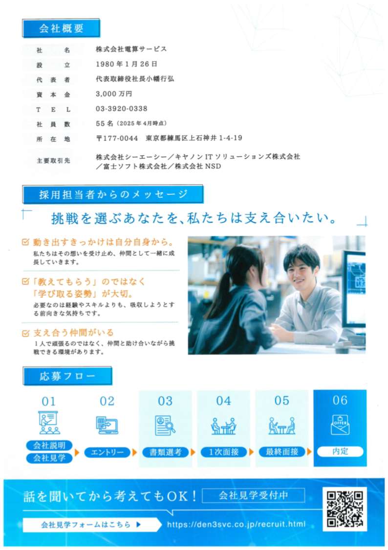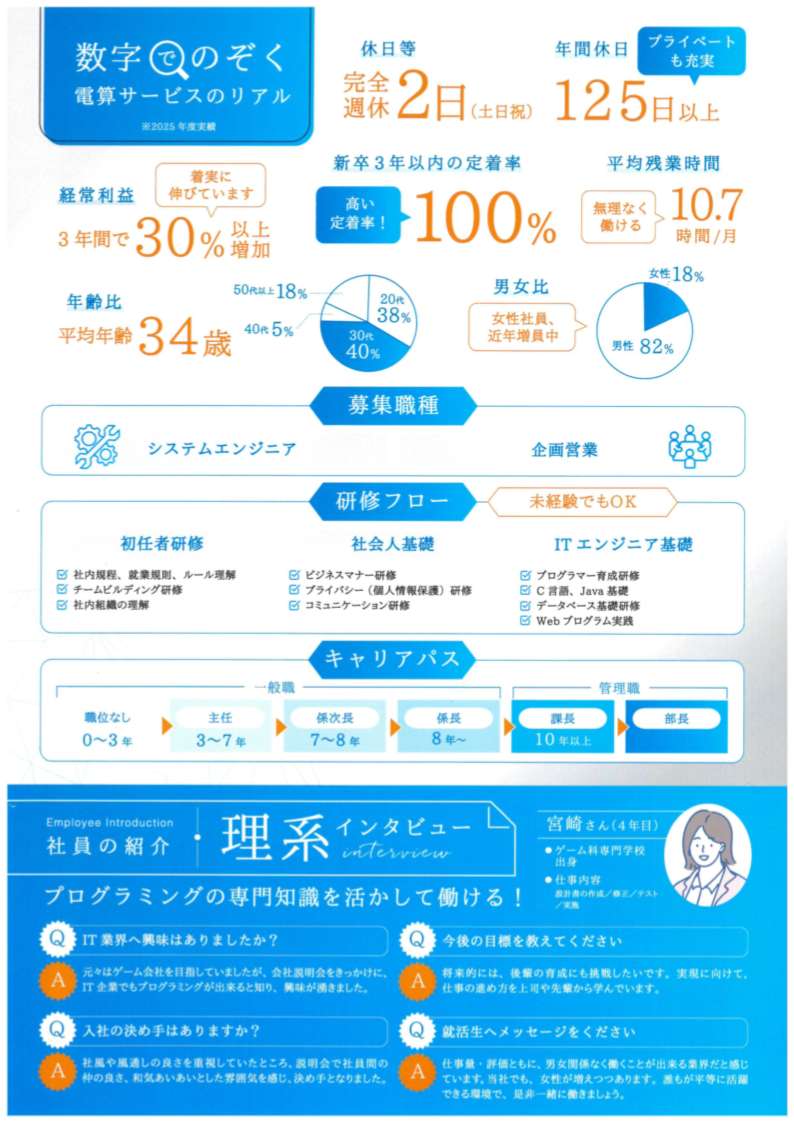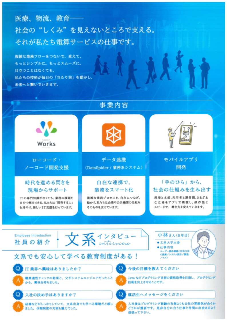 パンフレットでは、事業内容や社員紹介、研修制度のほか、採用担当からのメッセージも掲載し、